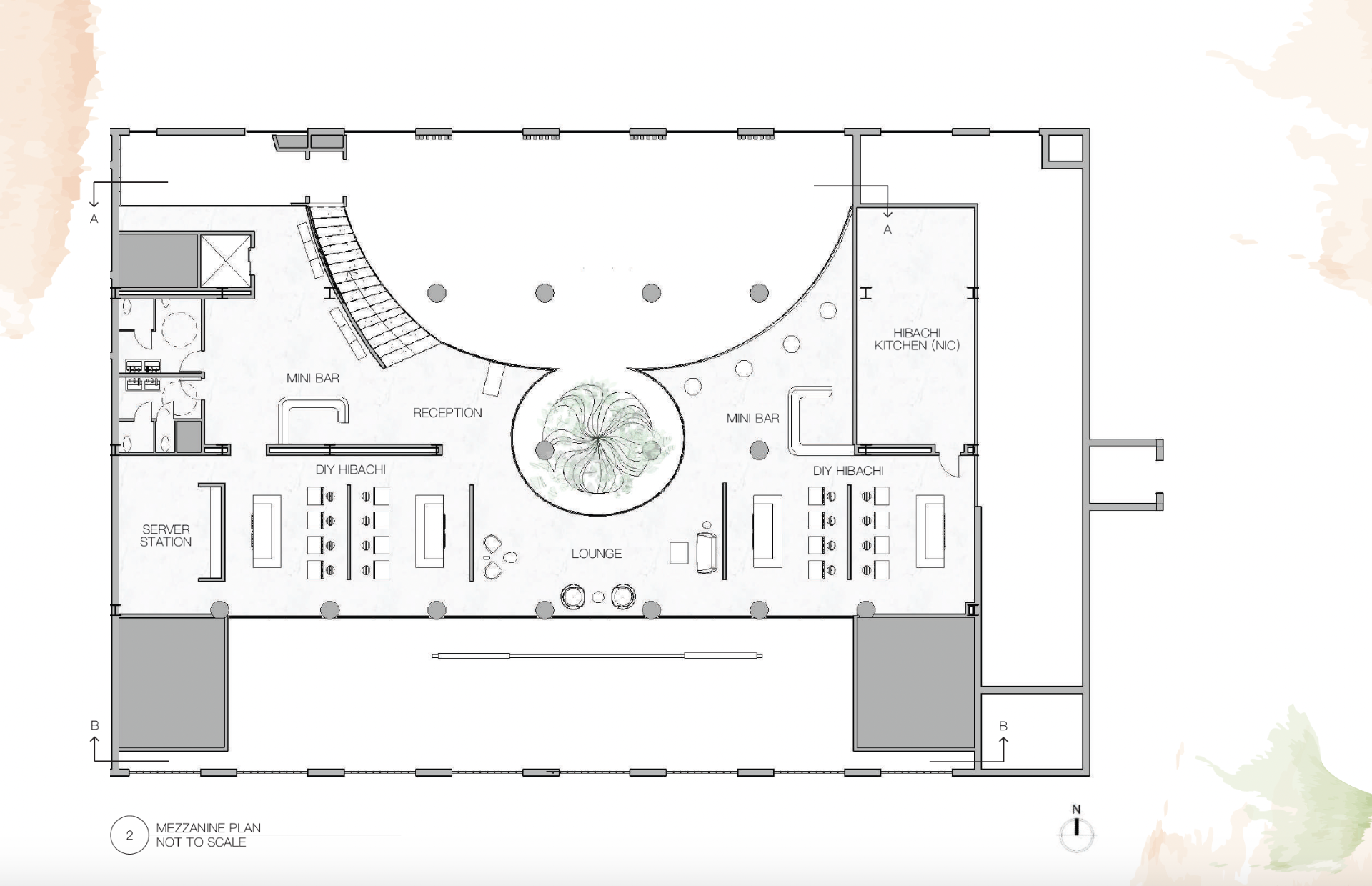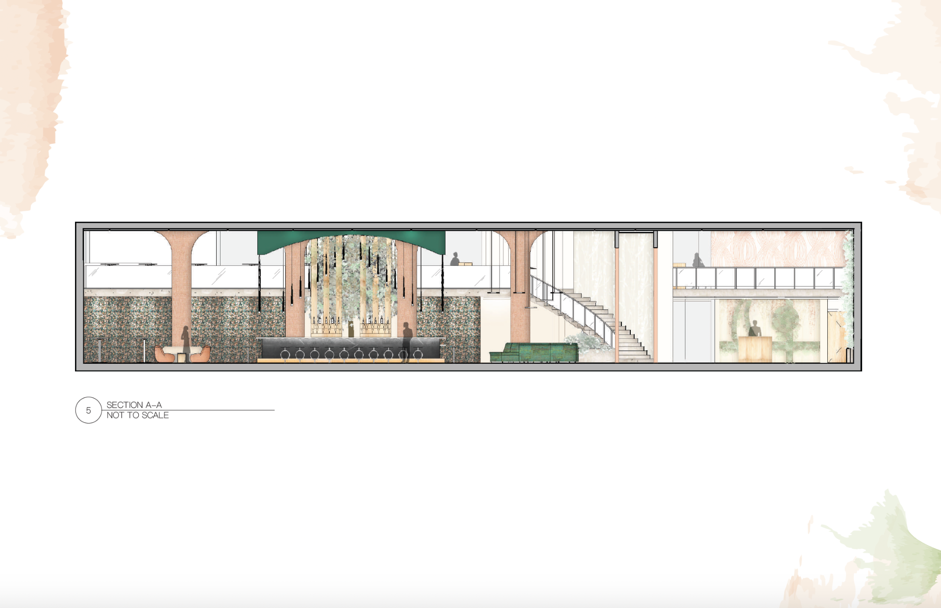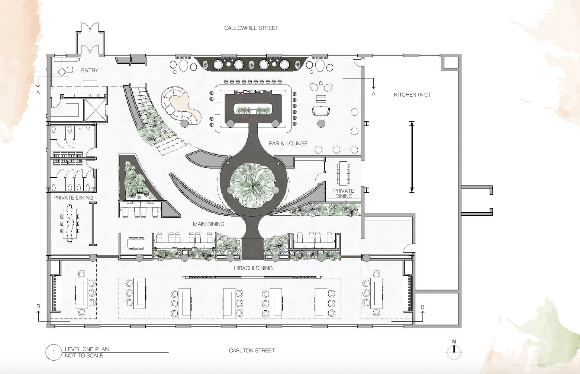 The site of the restaurant design is located at 1666 Callowhill Street in Philadelphia, Pennsylvania. The primary objective for this project was to incorporate aspects of the Kuma River, such as its shape and flow, to generate a lively and freeform environment. This concept was then joined together with a very specific parti diagram that represents the space as a whole and supports the continuity and naturalness of the plan.