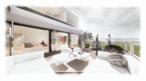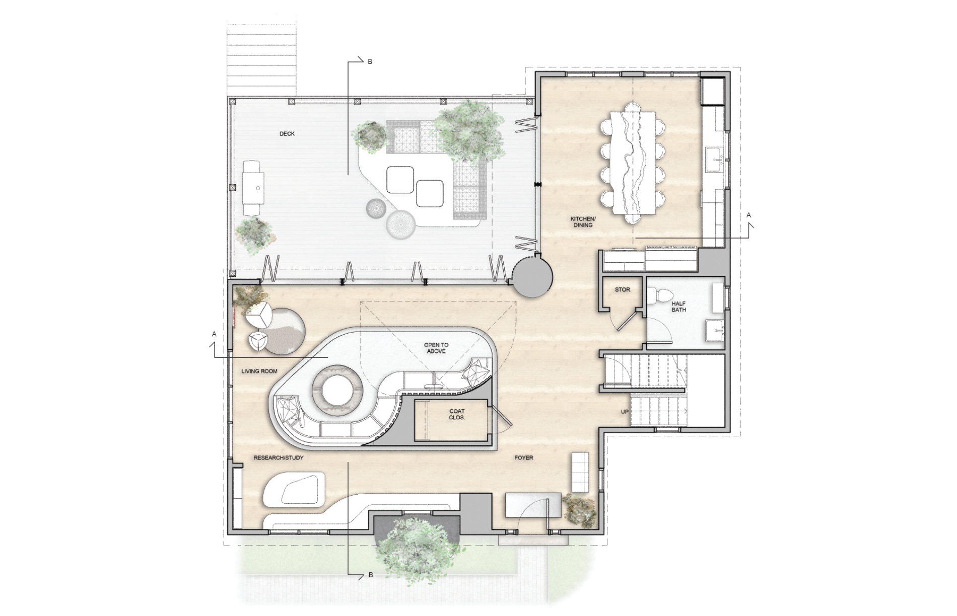 The site of the home design is located at 1375 Peckham Farm Road in Block Island, Rhode Island. The distinctive concept to be incorporated throughout the home was the ocean topography of Block Island, particularly Great Salt Pond. The key focus was to not incorporate the literal forms of sea life, but to rather form a connection between the variety of forms, shapes and flows that are present underwater and to bring them above water into the home to coordinate with the client's profession, marine biology.