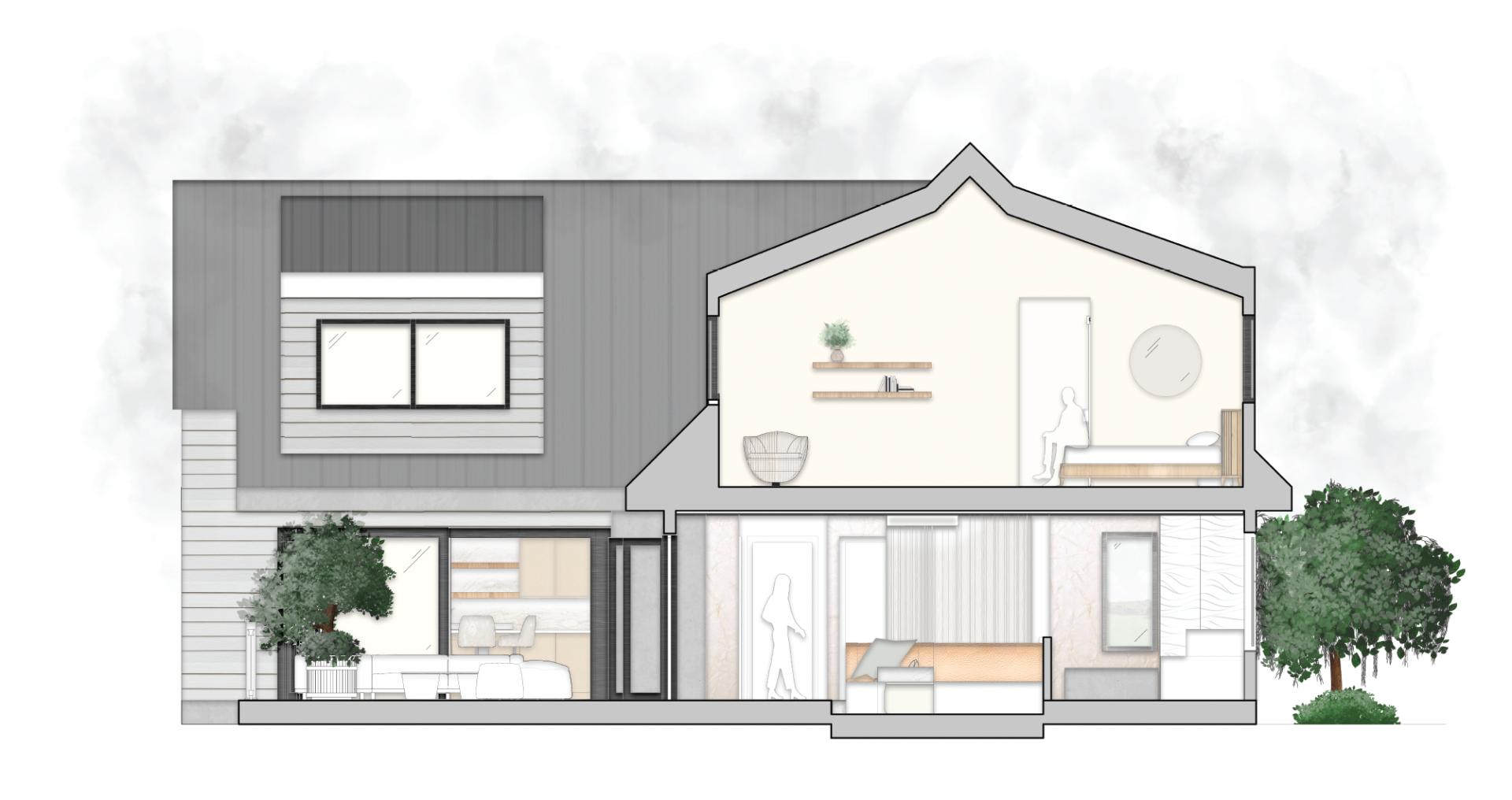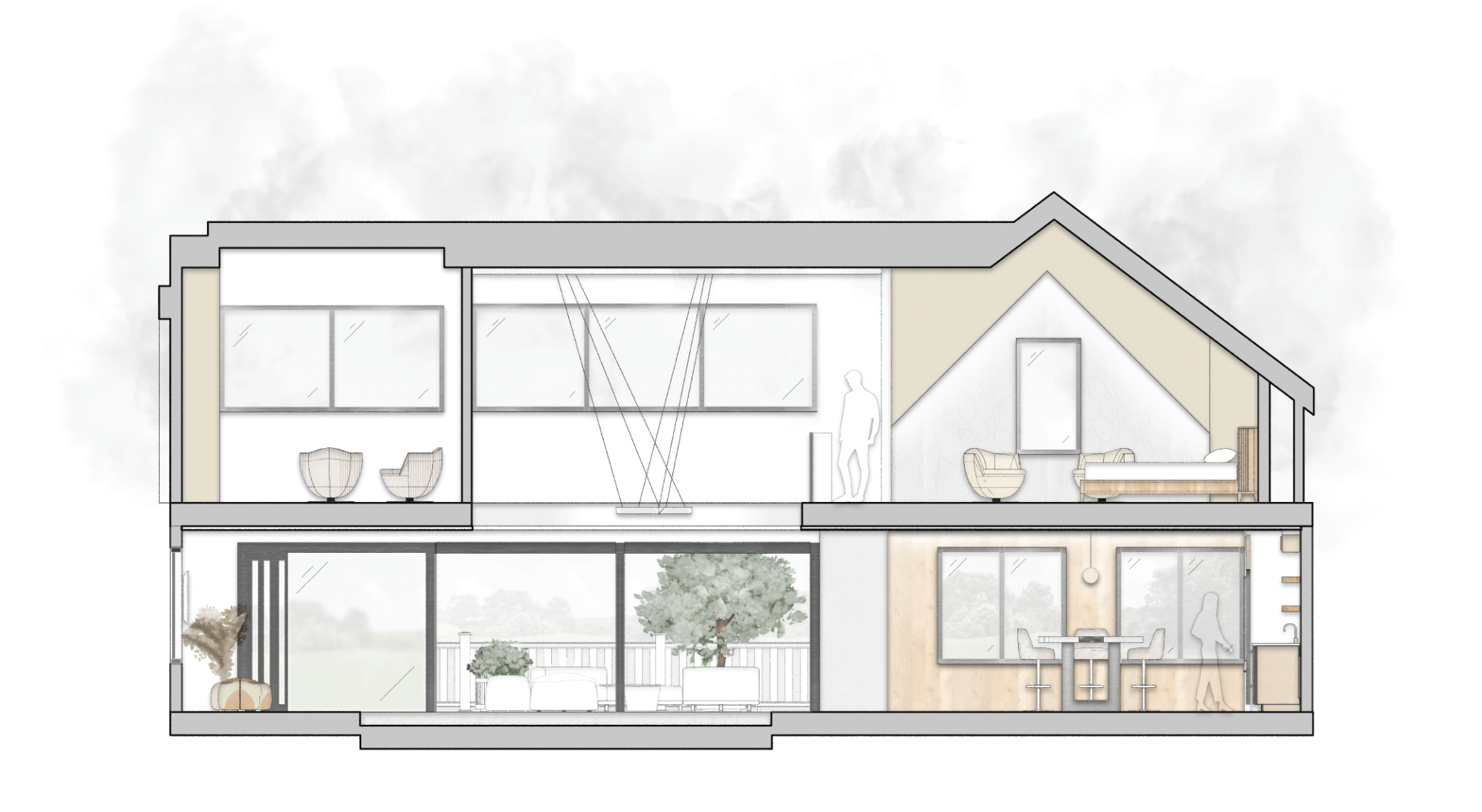 The objective of the Maker's Loft and Gallery was to generate a space for a client with particular specifications. The user was an artist who displayed his or her work from within their home, but was also a place where he or she resided. A conjoint use of space led to the exploration of public and private spaces within the same complex.